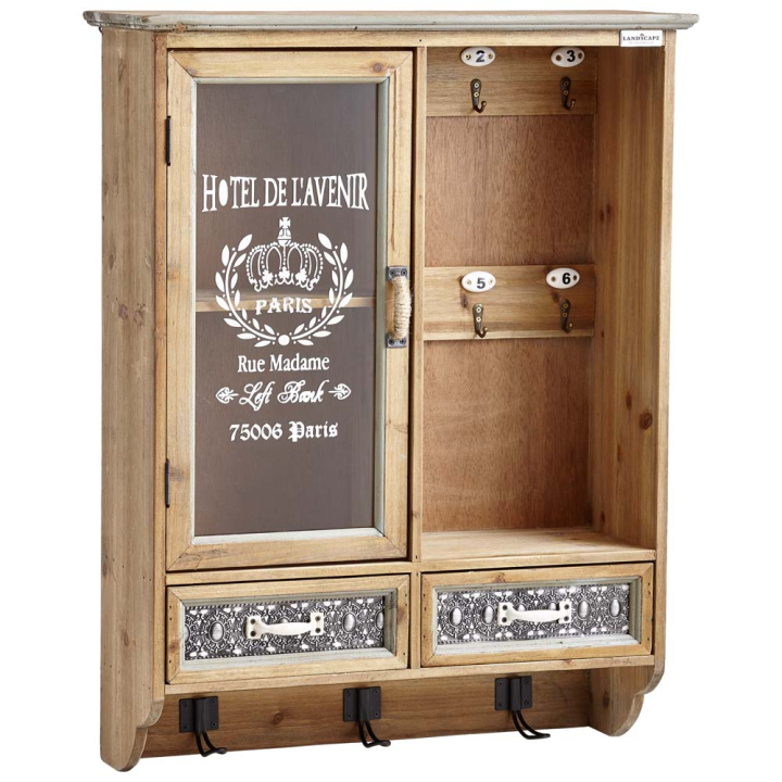 Стенна витрина във винтидж стил с размери на модела 53.5/18.5/69.5 см. Артикулът е предназначен за стенно окачване за удобното съхранение на ключове, чаши, прибори за готвени и др. малки предмети, като практично може да бъде поставен в антрето, кухнята или хола. Разполага с девет закачалки, като шест от тях са с номерация, монтирани в отворена ниша, а три в пространството под чекмеджетата. Зад вратата на панти с дръжка с увит канап и принтирана стъклена витрина е монтиран един рафт с приблизителна ширина от 23,5 см. Двете чекмеджетата на витрината са с много красиви фронтове с метален обков и бели метални дръжки, където място може да намерят вилиците, лъжиците или други малки предмети. Отличава се с многобройни красиви елементи, но силно впечатление, че ви направи принтираното стъкло е с кралски символ, изображение на корона с кръст и надпис Paris, поставени между две клонки, както и ефекта на състарена дървесина на дървените елементи на продукта.