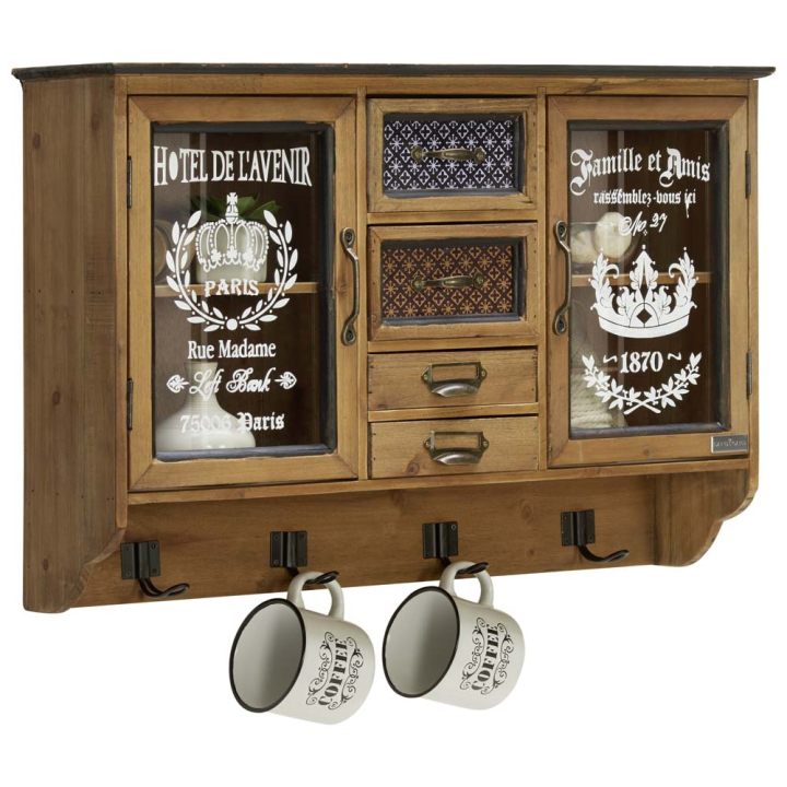 Тази винтидж витрина придава уют и автентично излъчване на всяко помещение. Със своите очарователни детайли, като декоративния бял принт върху стъклените врати и шарените фронтове на четирите чекмеджета, тя е идеалното допълнение към интериора. Изработена от масивно борово дърво с винтидж обработка, витрината се отличава с разнообразни дръжки, които подчертават нейния ретро стил.