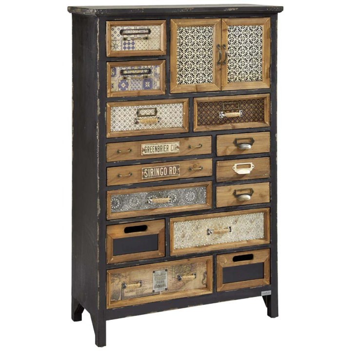Дизайнерски комод с 14 чекмеджета и 2 отделения с врати на панти с размери на модела Ш:76/Д:32/В:119 см. Умело комбинира боровата дървесина и метални елементи за създаването на уникален дизайн. Освен че, се откроява с различни цветове, веднага ще ви направи впечатление, че отделните чекмеджета на скрина са с различна големина и дълбочина, което е водещ акцент в дизайна на продукта. Артикулът е абсолютно нов, но някои от елементите са умишлено захабени за създаването на неповторима визия. Друга особеност на артикула са чекмеджетата, моделирани с различни по вид дръжки, като някои са само с отвор а други с метални елементи. Проектантите много умело са комбинирали различните материали, форми и декори при изработката на артикула, за да създадат истински мебелен шедьовър. Моделът е креативно решение за обзавеждане на дома, арт или дизайнерско студио, като със своята визия ще внесе много позитивна емоция. Със своите 14 чекмеджета и 2 отделения с вратички предоставя много място за съхранение. Притежава горен плот, където може да поставите цвете, което цялостно ще преобрази атмосферата в помещението със своята красота.