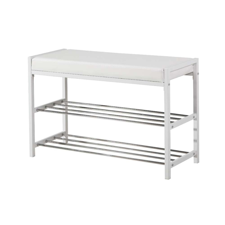 Компактен елемент, притежаващ удобна дунапренена повърхност от еко кожа в бял цвят, хармонираща с метална рамка в цвят хром, предоставящ практично място за поставяне на 6 до 8 чифта обувки с приспособено място за сядане.