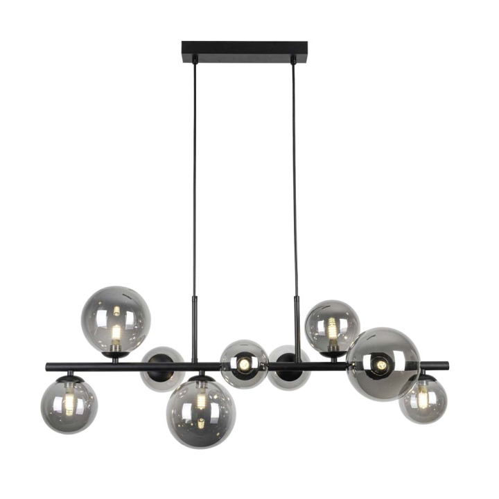 Полилеят е стилен и се вписва във всеки модерен интериор. С 9 абажура с опушено стъкло и черен метален корпус, които акцентират във всяка спалня или всекидневна.