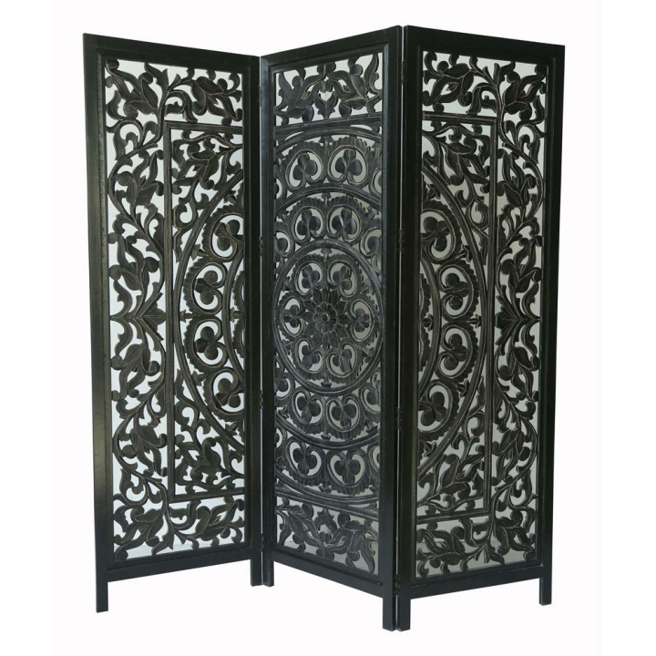 Черен параван с три крила, изработен в комбинация от мангово дърво и MDF, с цялостна дърворезба в ретро стил.