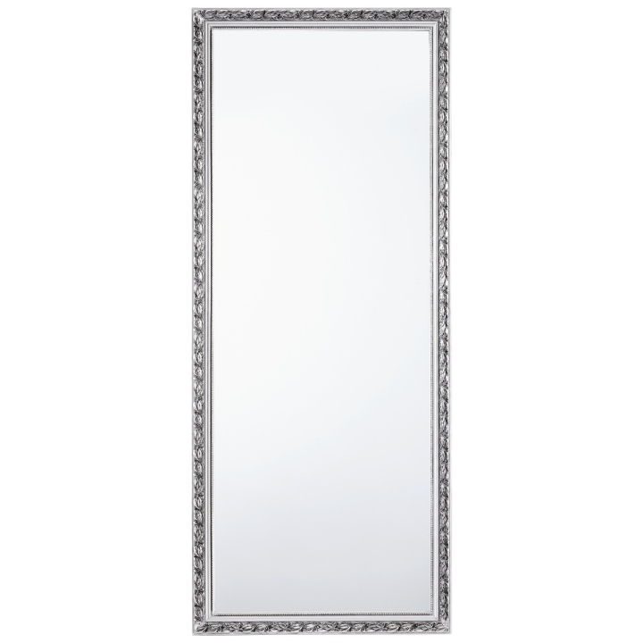 Правоъгълно стенно огледало с рамка от евкалиптово дърво с флорална резба, лакирана в антично сребристо, 70/170 см.