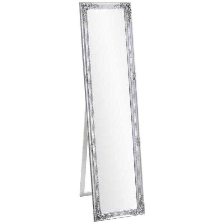 Правоъгълно огледало със стойка, с рамка от евкалиптово дърво с декоративна резба, лакирана в антично сребристо, 40/160 см.