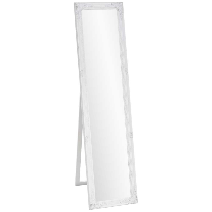 Правоъгълно огледало със стойка, с рамка от евкалиптово дърво с декоративна резба, лакирана в бяло, 40/160 см.