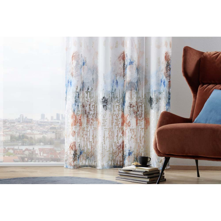 Тънко бяло перде с цветна акварелна декорация в долната част и комбиниран перделик за закачане на тръбен или релсов корниз, 140/245 см