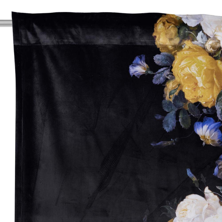 Плътно черно перде с цветен флорален мотив с перделик за закачане на тръбен или релсов корниз, 135/245 см
