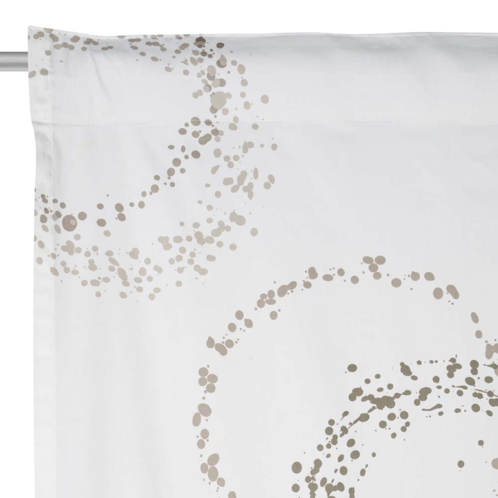 Бяло плътно перде с перделик със стилизиран мотив кръгове, подходящо за закачане на тръбен или релсов корниз, 135/255 см