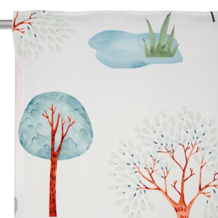 Детската стая винаги е много жизнерадостна и наситена със свежа енергия! Завесите, като ключов детайл в интериорното решение, трябва да допълват тази чудна атмосфера и да дават усещане за уютна защита. Мотивът с цветни дръвчета постига това, като е изобразен върху елегантен, плътен полиестер. Перделикът, ушит в горната част, дава възможност за вариации и промени по всяко време, без затруднение. Независимо от вида корниз, който имате, пердето е адаптируемо и изключително лесно за бърз монтаж както на тръбен, така и на релсов модел. Когато през прозореца навлиза ярко слънце, а детето трябва да поспи, сладките декорации ще му пожелаят уютна дрямка в притъмнена обстановка. Вечерно време шарената завеса ще запазва личния комфорт и необходимото уединение при светнати лампи.