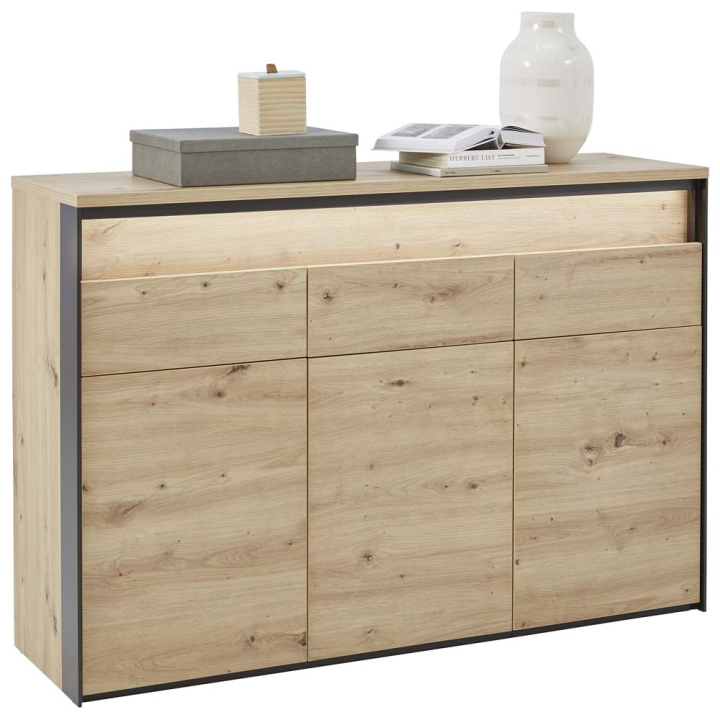 Комод с атрактивен дизайн без дръжки, три чекмеджета и декоративно LED осветление с размери Ш:130/Д:38/В:88 см. Моделът е практично и функционално обзавеждане, както за дома така и за офиса. Притежава три отделения с три врати на панти, зад които са монтирани шест вътрешни рафта за удобното съхранение на лични вещи и аксесоари. Плотът на скрина е с големина 130/38 см, където може да поставяте най-различни арт предмети, лични вещи и домашни предмети в хола. Притежава декоративно LED осветление, монтирано в ниша под плота, което със сигурност ще добави много чар и уют към помещението. Продуктът е произведен от ПДЧ и MDF в светъл дървесен декор, който ще ви плени със своята естествена текстура на дървесината.