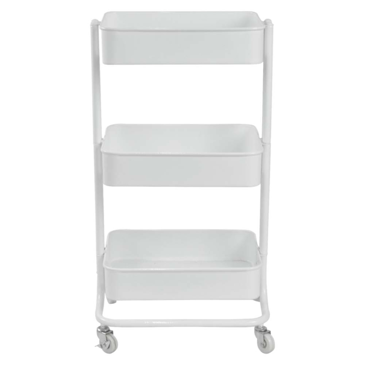 Универсална количка с размери Ш:43/Д:35/В:78.5 см. Тази количка бързо ще се превърне в полезен помощник в ежедневието със своите три дълбоки метални рафта и четири колелца въртящи се на 360° за лесно позициониране. Моделът е подходящ, както за съхранение и пренасяне на кухненски прибори, храни, напитки и аксесоари, така и на офис консумативи и предмети. Поради това, че е произведена от метал, поддръжката и е изключително лесна. В зависимост от индивидуалните ви предпочитания може да изберете да бъде в бял или тъмносив цвят.