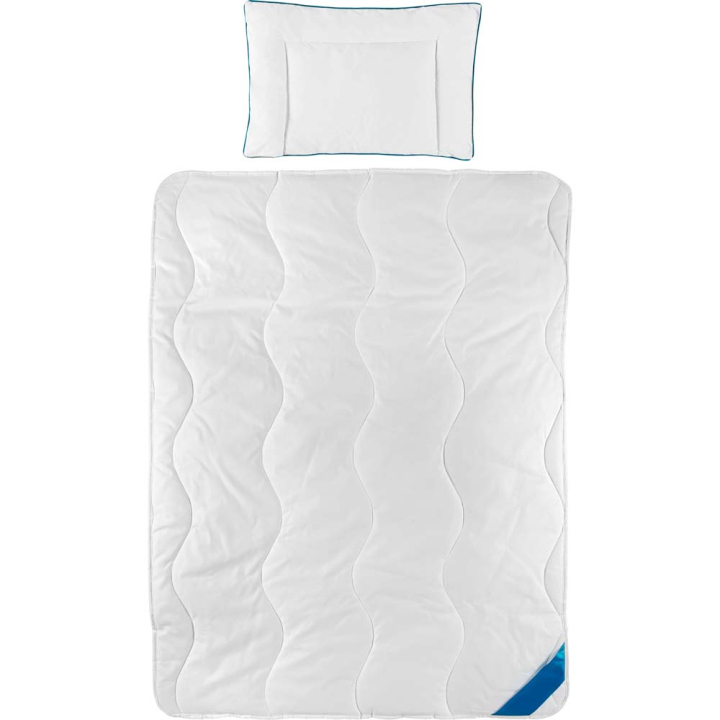 Този детски спален комплект от 2 части в бяло осигурява спокойни сънища на вашето любимо дете. То ще се сгуши уютно в юрганчето и ще спи сладко и здравословно, докато расте. Пълнежът от TENCEL™ Lyocell и Dacron® предлага изключително меко усещане при допир.