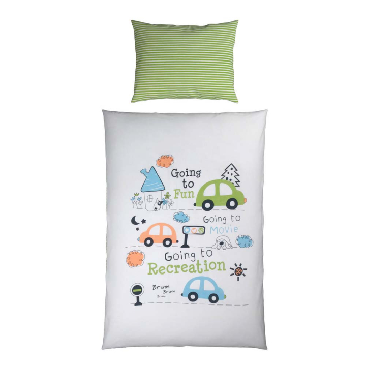 Този закачлив спален комплект ще отведе всяко дете в света на мечтите. Изработен от 100% памук Ранфорс, притежава специфични свойства за комфортен сън: естествените влакна са дишащи и абсорбиращи. Благодарение на регулиращия температурата ефект, гладкият плат е издръжлив и приятен на допир. А зелената долна страна на райета носи по-изчистен и спокоен вид на детската стая.