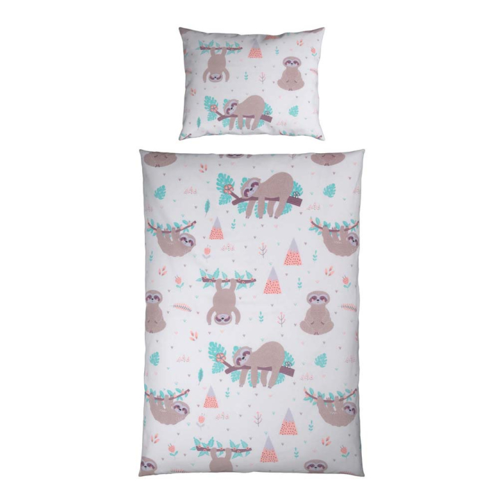 С този спален комплект, леглото на всяко дете ще бъде покана за релаксиращ сън в красива и уютна атмосфера. Изработен от 100% памук Ранфорс, притежава специфични свойства за комфортен сън: естествените влакна са дишащи и абсорбиращи. Благодарение на регулиращия температурата ефект, гладкият плат е издръжлив и приятен на допир. А дизайнът със спящи ленивци е закачлив и носи страхотно настроение на детската стая.