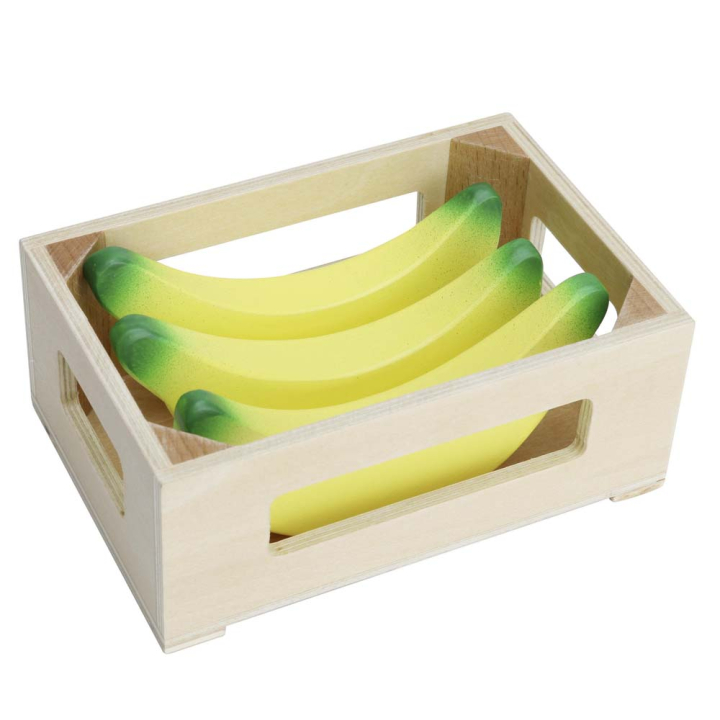 Детска играчка - дървена щайга с банани, имитираща продукти от супермаркет.