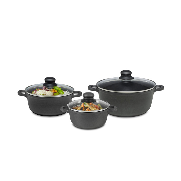 Този комплект за готвене от три тенджери с индивидуален размер, съдържа всичко необходимо за вашите кулинарни приключения в кухнята. Наравно с модерната визия в матов черен цвят, негово предимство е материалът от лят алуминий и неръждаема стомана, което осигурява дълъг живот, запазване на първоначалния вид и ежедневна радост около семейната трапеза.