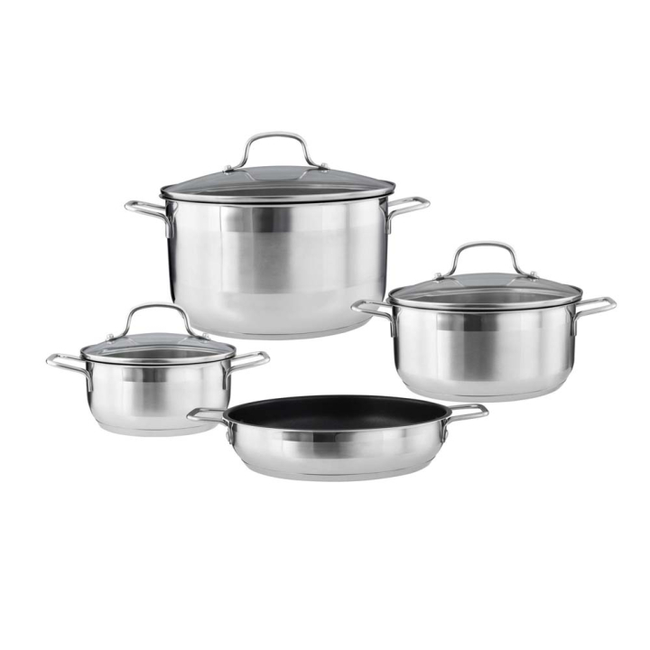 Комплектът е сертифициран (LFGB), изработен от полирана неръждаема стомана, с незалепващо покритие и висококачествено прозрачно стъкло, с топлинна устойчивост до 150°C