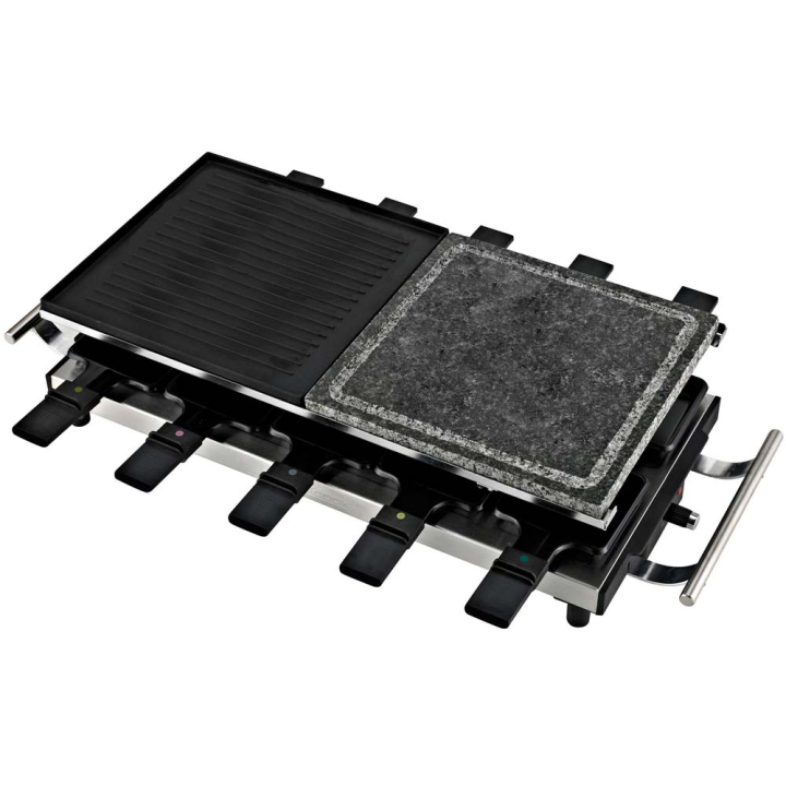RACLETTE скарата е подходяща за всякакво месо и зеленчуци, а раклетите са идеални за различни видове сирена. Скарата е с регулируем термостат и светлинна индикация и горната плоча може да се сваля.