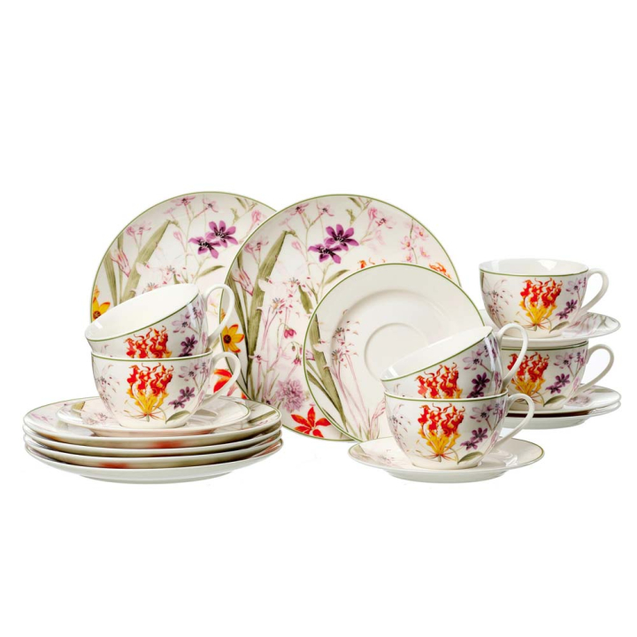 Пролетна феерия, разпръскваща свежест и радост от живота във вашата трапезария! Комплектът е подходящ за сервиране на сутрешна закуска с кафе, следобеден десерт с капучино или чай с бисквитки в любима компания. Цветовете и красивата повърхност на порцелана са устойчиви при затопляне в микровълнова фурна и почистване в съдомиялна машина.