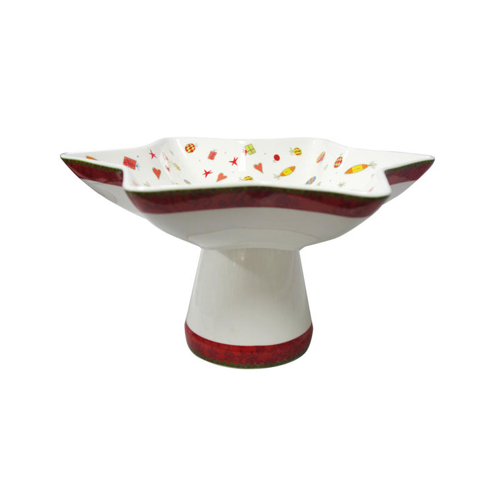 Добавете още настроение към празничната атмосфера в дома с един красив и функционален аксесоар! Цветното плато е на пиедестал, с красива форма на звезда и елегантно излъчване. С лика на веселия и закачлив Дядо Коледа, заобиколен с много играчки за елха, то ще бъде чудесна основа за всичко, което пожелаете. Подредете върху него ароматните коледни сладки, нарежете сирена с плодове и ги аранжирайте за допълнение към отлежалото вино. Сгънете малки късметчета и ги оставете на платото, заедно с любими бонбонки, за да може всеки от семейството да избере своето. Друг вариант е, да го изполвате за декорация с коледни топки, шишарки и дребни украси, и да го приобщите към цялата премяна в празничния интериор. Добра идея и за поднасяне като внимателно подбран тематичен подарък на близък човек.