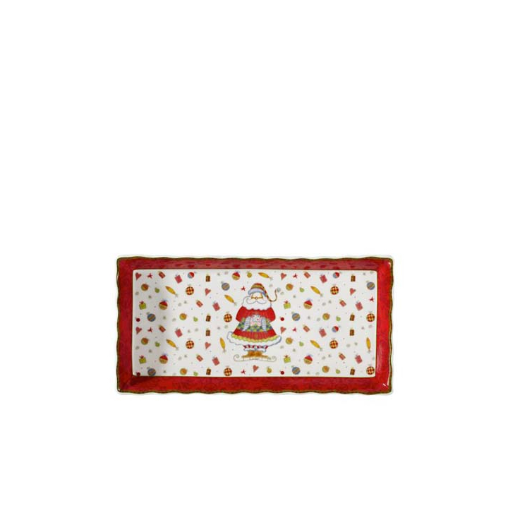 Добавете още настроение към празничната атмосфера в дома с един красив и функционален аксесоар! Продълговатото цветно плато с лика на веселия и закачлив Дядо Коледа, заобиколен с много играчки за елха, ще бъде чудесна основа за всичко, което пожелаете. Подредете върху него ароматните коледни сладки, нарежете сирена с плодове и ги аранжирайте за допълнение към отлежалото вино. Сгънете малки късметчета и ги оставете на платото, заедно с любими бонбонки, за да може всеки от семейството да избере своето. Друг вариант е, да го изполвате за декорация с коледни свещи, шишарки и дребни украси, и да го приобщите към цялата премяна в празничния интериор. Добра идея и за поднасяне като внимателно подбран тематичен подарък на близък човек.