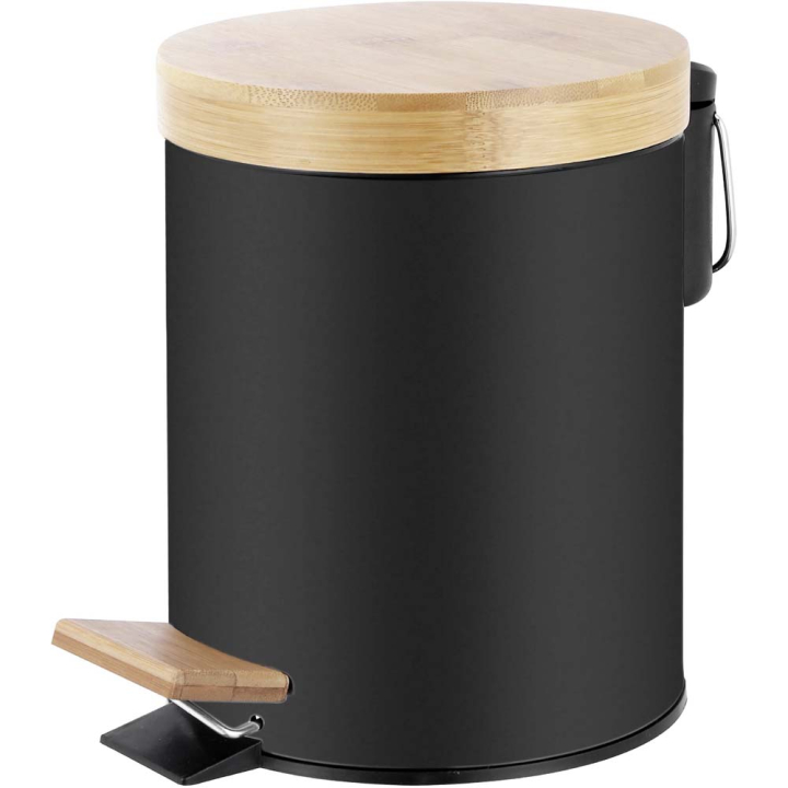 Черен метален кош за отпадъци с бамбуков капак, 5л