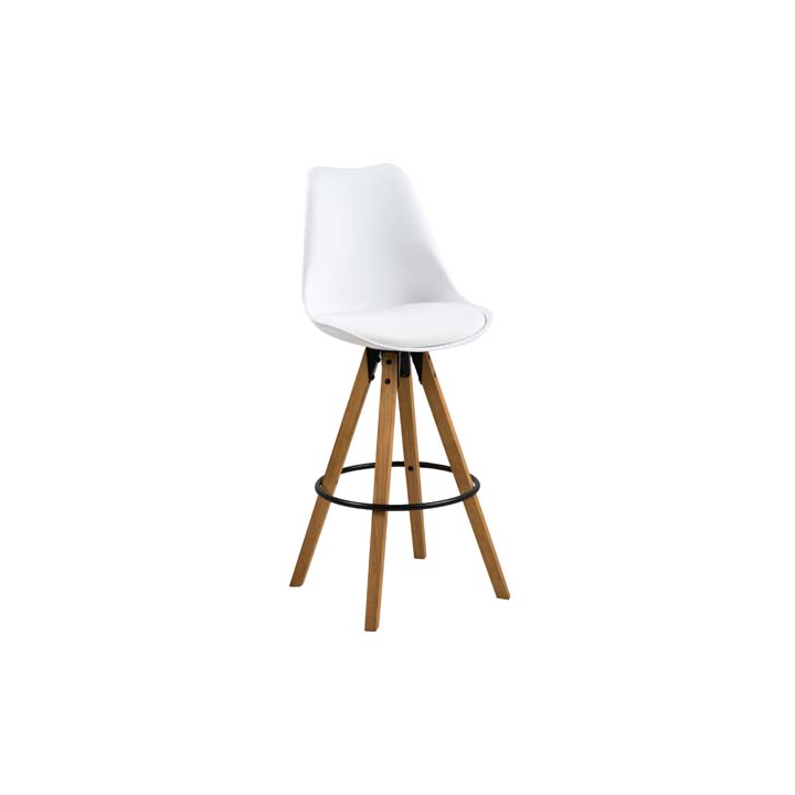 Модерен и функционален бар стол с размери Ш:49/Д:55/В:112 см. Седалката и облегалката на стола са произведени от висококачествен полимер, поставени на станок основа, състояща се от четири дървени крака. Столът е така проектиран, че при седене тялото да заеме най-удобна позиция, а краката максимално облекчени, удобно поставени на обръчовата степенка. Моделът е с максимална товароносимост от 110 кг, като може да бъде закупен в бял или черен цвят.