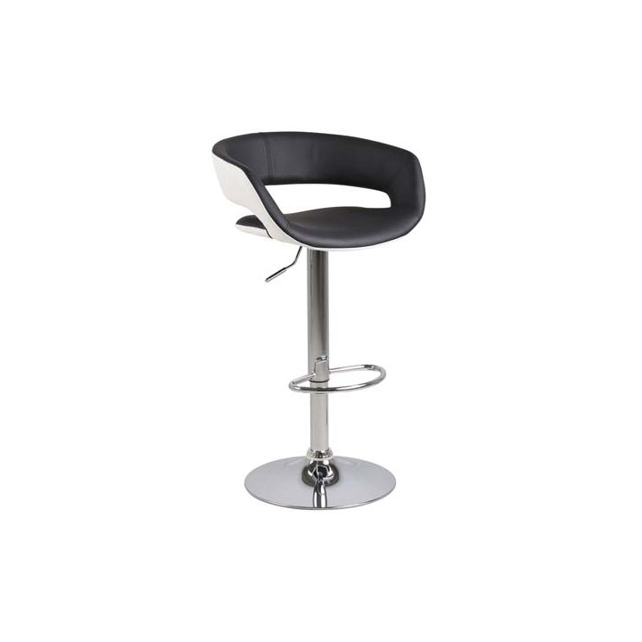 Модерен и комфортен бар стол, в комбинация на бяла и черна еко кожа, с хромирана метална основа и регулируема височина. Габаритен размер: Ш:55/Д:49/В:104 см.