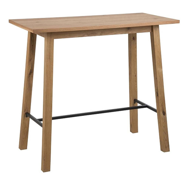 Бар маса с размери Ш:117/Д:58/В:105 см. Моделът притежава неподражим домашен чар. Произведена е от масив (дъбов фурнир) с декор див дъб. Плотът е с големина 117/58 см, поставен на четири правоъгълни крака, допълнително укрепени с метална стойка за крака за удобен престой. Моделът е произведен в типично скандинавски стил, но металната стойка добавя нотка индустриален характер към масата. Удачно може да комбинирайте модела с високи табуретки или бар столове със сходен дизайн, за да създадете перфектната домашен бар атмосфера. Бар масата е с капацитет да настани удобно около 6 човека. Отдайте се заслужено на домашно приготвен коктейл, студена бира или чаша с ароматно вино в страхотна атмосфера. Наслаждавате се на вкусни хапки в компанията на приятели или любим човек, удобно настанени около масата.