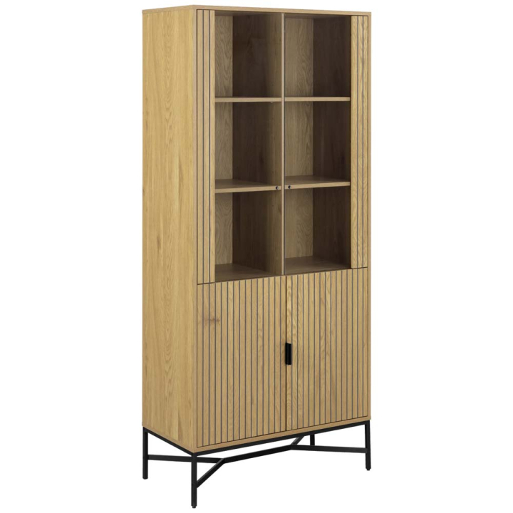 Елегантна и практична, витрината Джайпур съчетава удобство и минималистична визия в индустриален стил. Чудесно допълнение към дневна или трапезария, тя ще внесе ред със своето функционално разпределение. Моделът предоставя място за дискретно съхранение зад плътни врати в долната част и горна част със стъклени врати, зад които изложите на показ любимите си декоративни елементи.