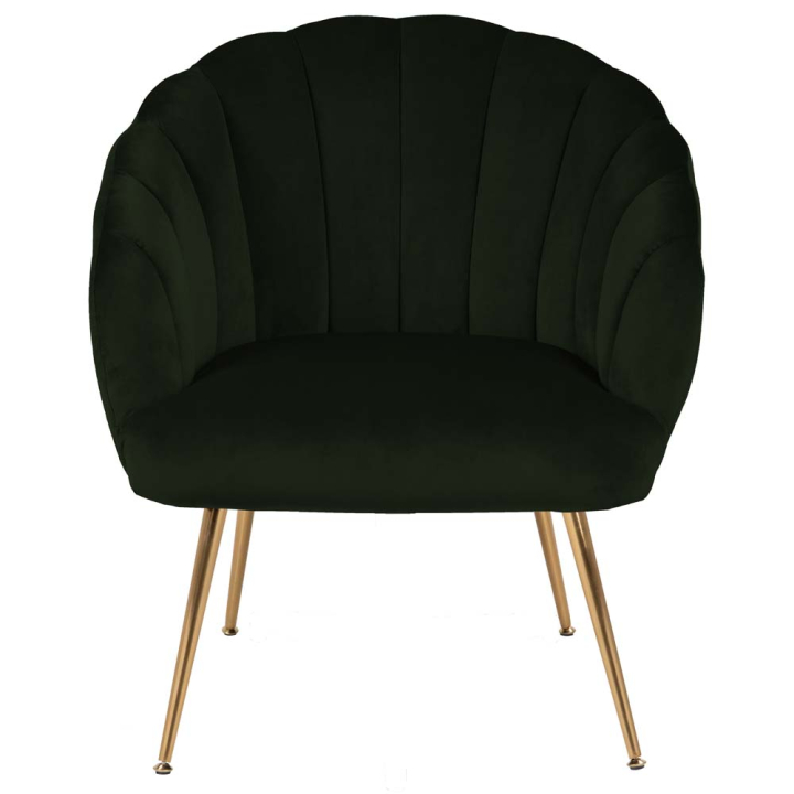 Тапицирано кресло с кадифена дамаска и размери Ш:76/Д:76/В:81 см. Облегалката на креслото има формата на перлена мида. Пълнежът на тапицерията е от обемна полиуретанова пяна, осигуряваща усещането за комфорт по време на седене. Краката на стола са произведени от стомана, в модерният цвят месинг. Това кресло бързо ще се превърне в любимото ви място за релакс и почивка. Неговият силно въздействащ дизайн, би се вписал чудесно в интериора на шикозна дневна, обзаведена в ретро, съвременен или Шаби Шик стил.