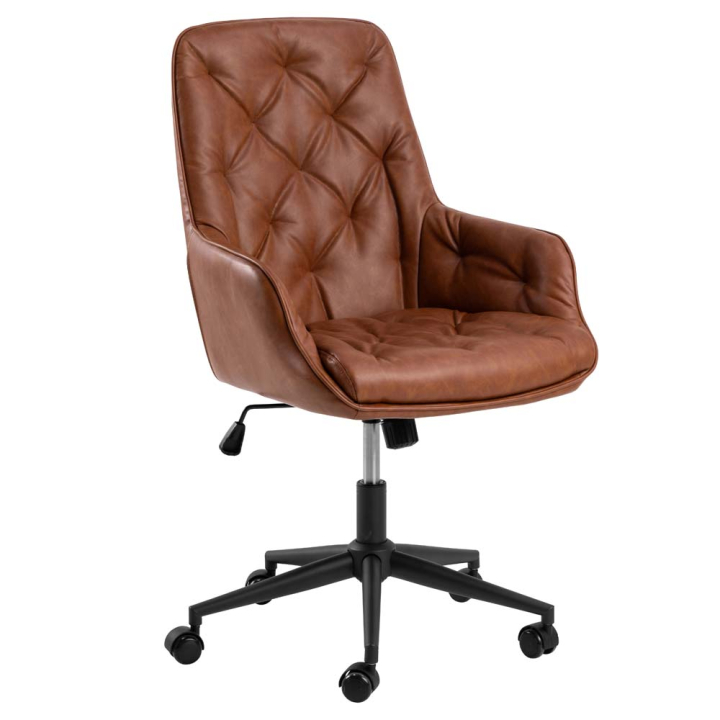 Този офис стол е създаден, за да осигури удобство и стил на вашето работно място. Седалката е тапицирана с висококачествена кафява еко кожа, която съчетава елегантност и лесна поддръжка. Газовият амортисьор позволява плавно и лесно регулиране на височината за максимален комфорт. Основата е изработена от прахово боядисана стомана, осигуряваща стабилност и дълготрайност.