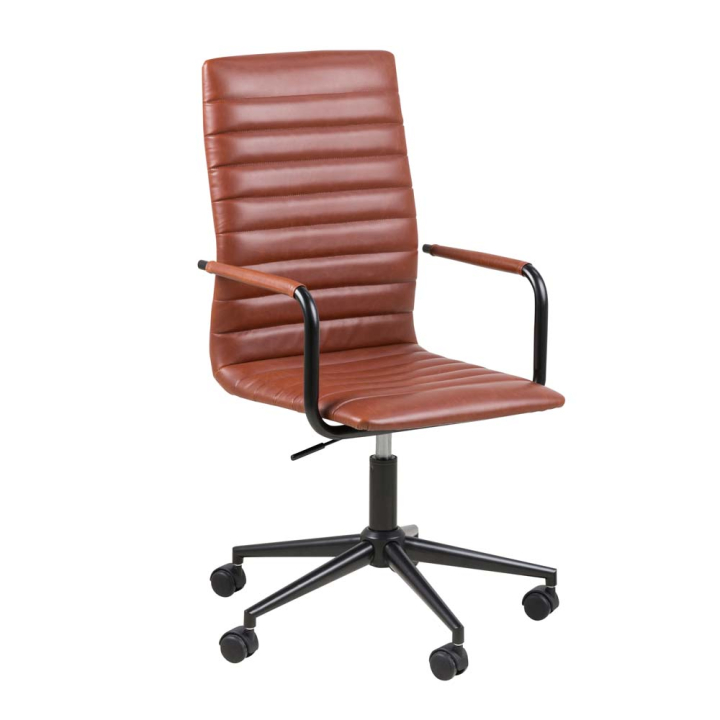 Този офис стол е създаден, за да осигури удобство и стил на вашето работно място. Седалката е тапицирана с висококачествена кафява еко кожа, която съчетава елегантност и лесна поддръжка. Газовият амортисьор позволява плавно и лесно регулиране на височината за максимален комфорт. Основата е изработена от прахово боядисана стомана, осигуряваща стабилност и дълготрайност.