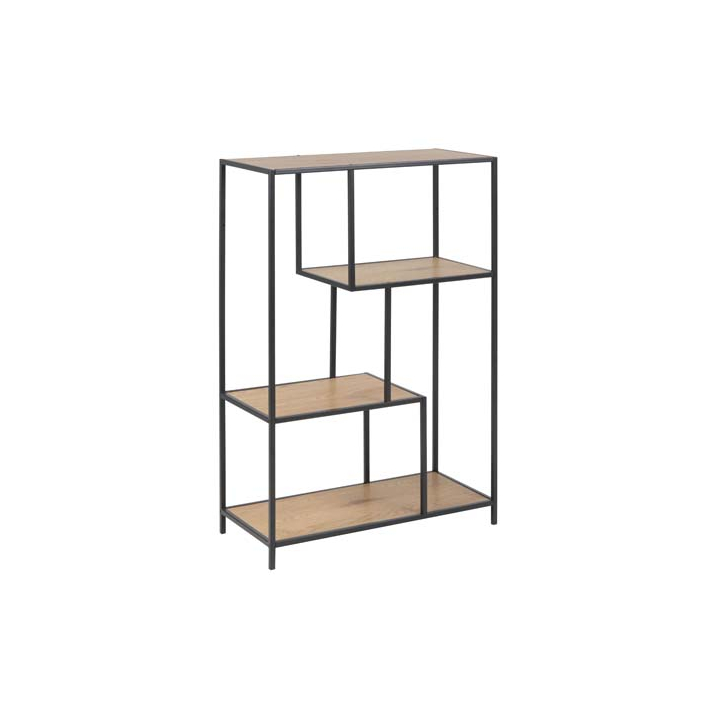 Благодарение на филигранния си дизайн, тази модерена стояща стоманена етажерка придава усещане за лекота. Тънки надлъжни подпори, изработени от прахово боядисана стомана в черно, образуват рамката и свързват стъпаловидните нива.