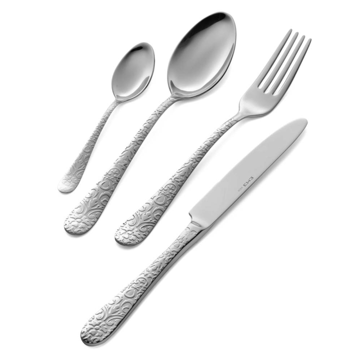 Portofino е колекция прибори с елегантна форма и 3D флорална гравюра на дръжките. Релефната декорация е създадена още с оформянето на самите прибори. Ефектът на огледало подчертава високото качество на неръждаемата стомана 18/10, като акцентира върху формите и дизайна.