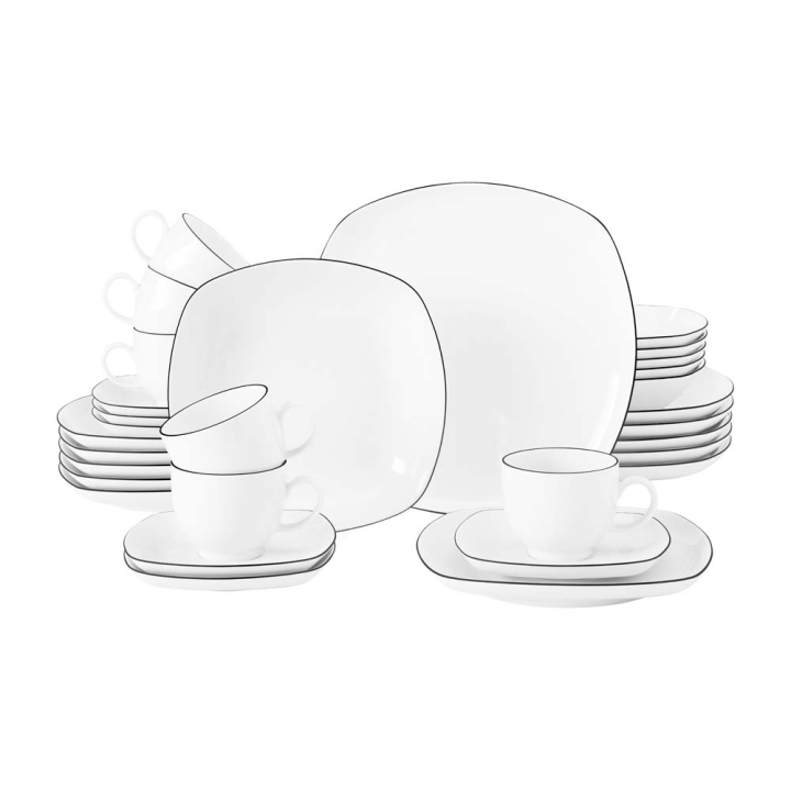 Бял порцеланов сервиз от 30 части за сервиране на храна и топли напитки с черна линейна декорация