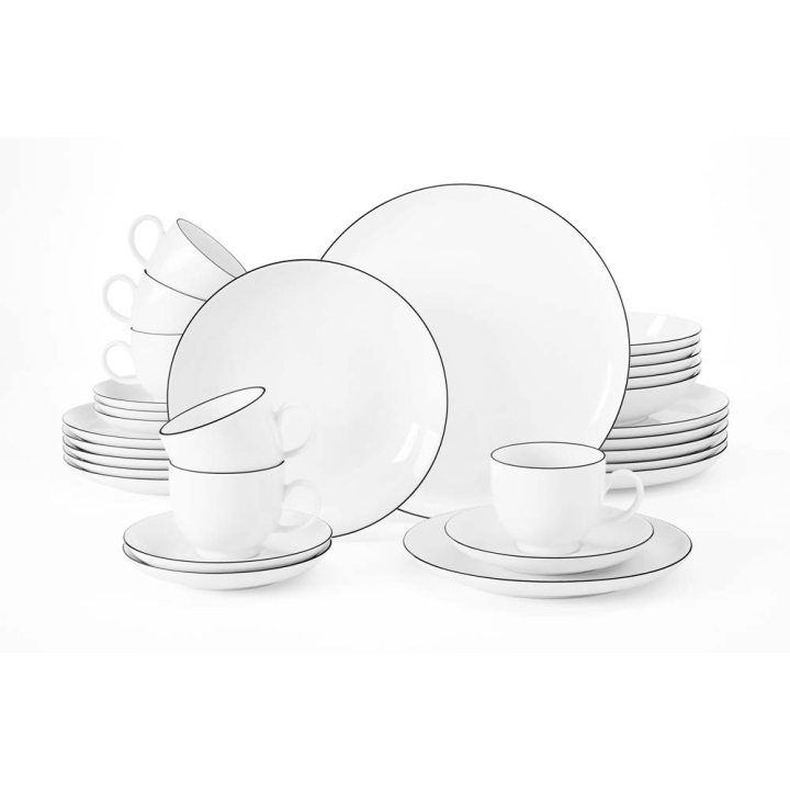 Бял порцеланов сервиз от 30 части за сервиране на храна и топли напитки с черна декорация по краищата