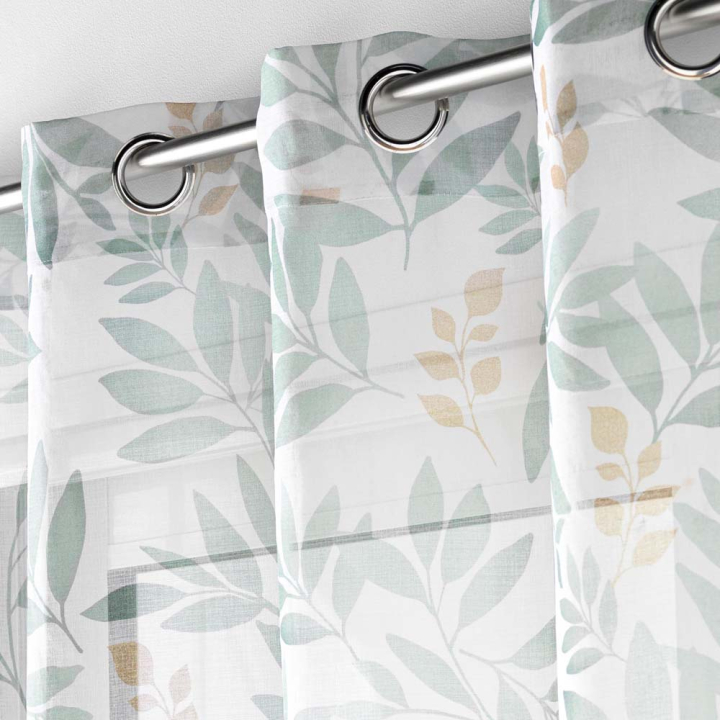 Тънко полупрозрачно перде 140/260 см с флорална декорация в бяло, зелено и мента, с капси - подходящо за закачане върху тръбен корниз
