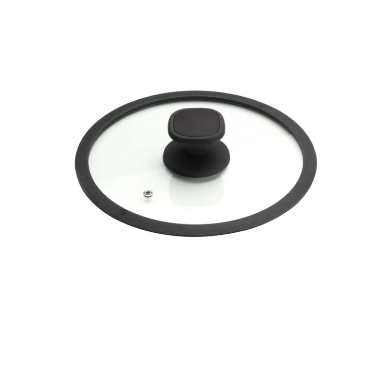 Плосък стъклен капак от серия PRO с черен силиконов пръстен 20 см - висококачествена, устойчива линия с акцент върху модерните форми.