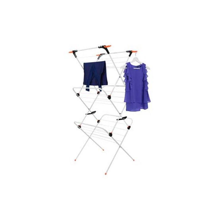 Вертикален сушилник за дрехи, който спестява пространство в помощението Със защита против надраскване на подовата настилка Има защитни ъглови елементи, които служат и за закачалки