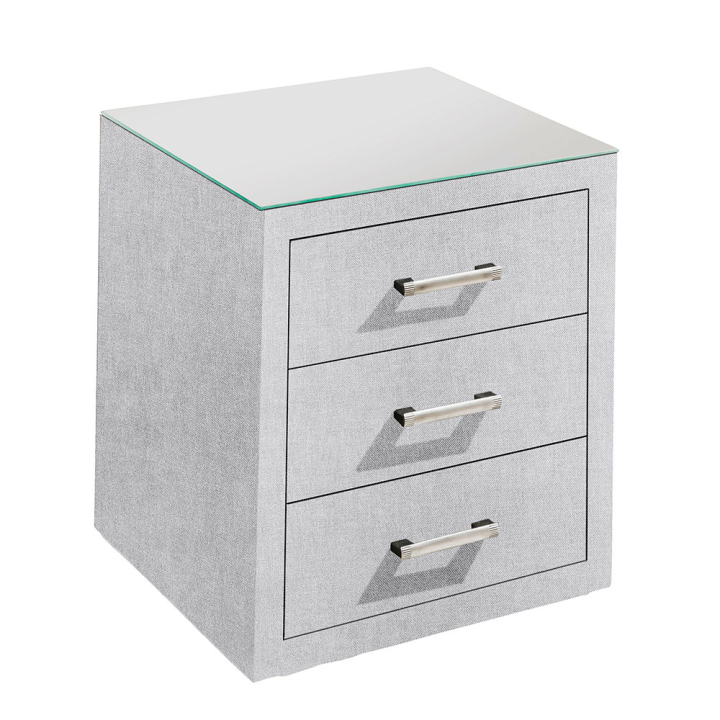 Тапицирано нощно шкафче с размери Ш:50/Д:45/В:54 см. Притежава компактен плот, под който са обособени 3 чекмеджета със сребристи дръжки. Върху плота е поставено предпазно стъкло за удобното поставяне на предмети. Със своята атрактивна визия ще добави много уют към помещението. Текстилната дамаска с красива текстура е произведена от 100% полиестер. Удачно може да го комбинирате с тапицирано легло, за да обзаведете уютна спалня заредена с много чар и стил.