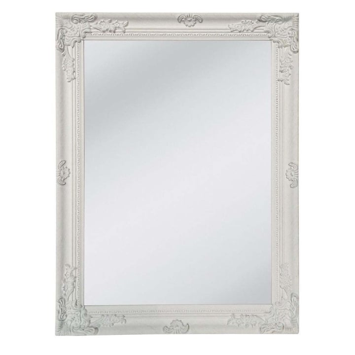 Правоъгълно огледало за стена с бяла дървена рамка и елегантна орнаментика, 60/80 см