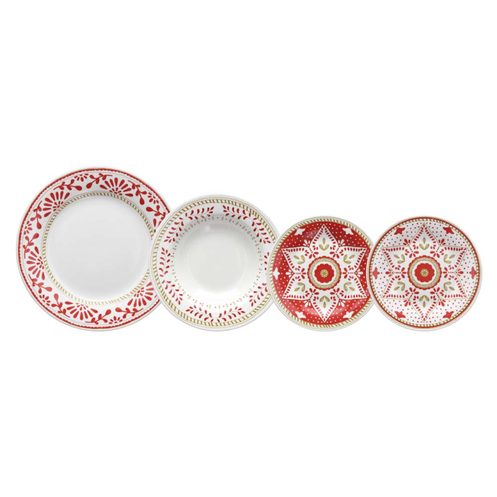 С новата колекция CHARME на италианската марка Tognana, коледната магия ще настъпи мигновено в дома! Вдъхновени от цветето Коледна звезда, съдовете са декорирани с очарователни детайли. Порцелановият сет е достатъчен за 6 човека, предлагайки 3 вида разнообразни по обем и дизайн чинии. Материалът е с високо качество и чудесна устойчивост във времето. Подходящ е за микровълнова фурна и за съдомиялна машина.
