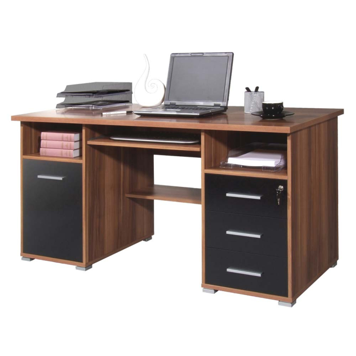 Компютърно бюро Класико с 1 врата, 3 чекмеджета и борд за клавиатура в декор орех и антрацит, размери: 145/70/75 см