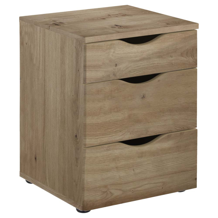 Конструкцията е произведена от ПДЧ, в светъл дървесен десен. Горното чекмедже е с размери: Ш: 29 x В: 6 x Д: 33 см и е характерно с по-малка площ, а долните две са идентични с размери: Ш: 29 x В: 9 x Д: 33 см.