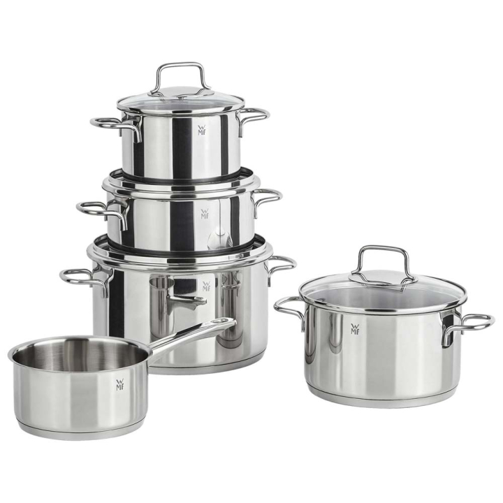 Комплект за готвене от 9 части, съдържащ 4 различни по големина тенджери с 4 бр. стъклени капаци и касерола. Изработен от неръждаема стомана Cromargan® 18/10 с универсална основа TransTherm®
