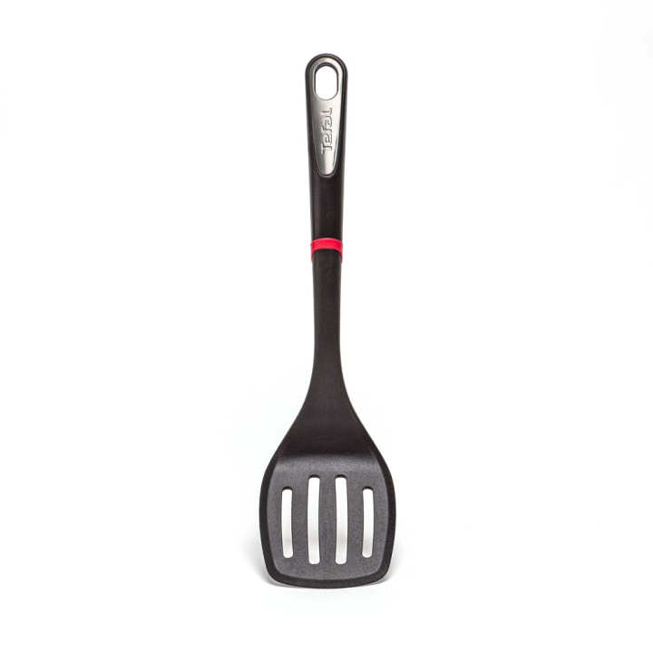 Решетъчна шпатула TEFAL Ingenio, изработена от пластмаса в черен цвят с червен акцент.