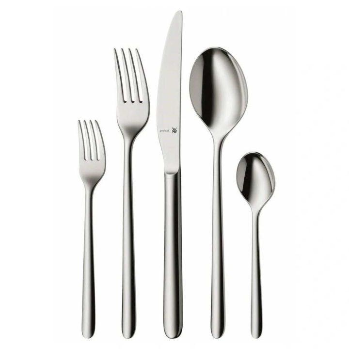 Този пълен комплект прибори, достатъчен за 12 човека, впечатлява първоначално със запазената марка на WMF - Cromargan® - една първокласна неръждаема стомана, устойчива на механични въздействия. Благородният материал не се повлиява от хранителни киселини, като в същото време предлага здравословен досег с всички видове храни и дълготрайна елегантност. Ножовете имат вградени остриета, изработени от закалена стомана специално за остриета - те запазват своята острота и еластичност за дълъг период от време.