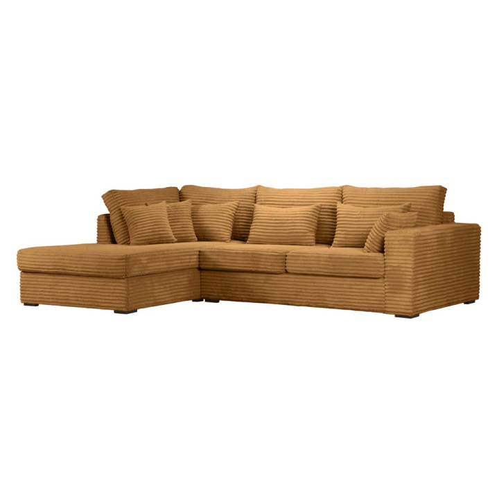 С визия предоставяща изискан дизайн, осигуряваща незаменим комфорт и удобство, тази ъглова холна гарнитура с десен подлакътник ще допринесе със стил и уют във вашия дом. Изработена с мека кадифена дамаска в цвят горчица (100% полиестер), тя е не само визуално впечатляваща, но и изключително приятна на допир.