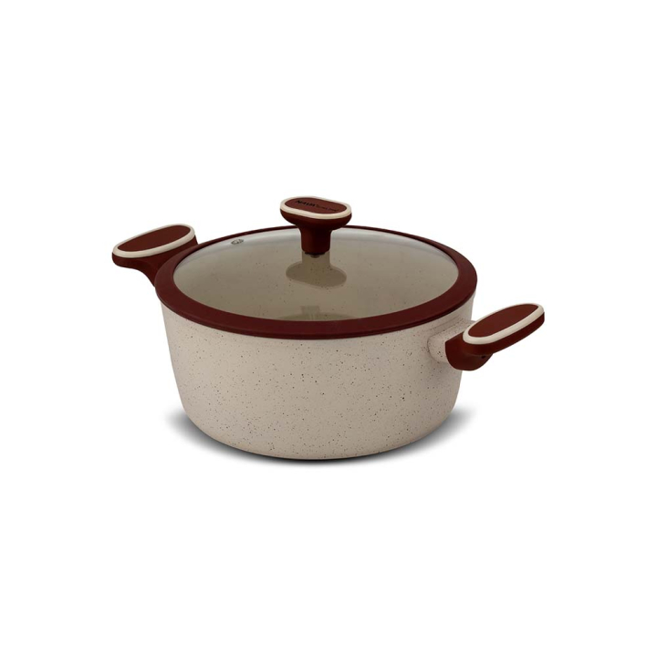 Бежовa тенджера с 3 слоя гранитно незалепващо покритие, стъклен капак и дръжки в кафяв цвят, Ф24 см